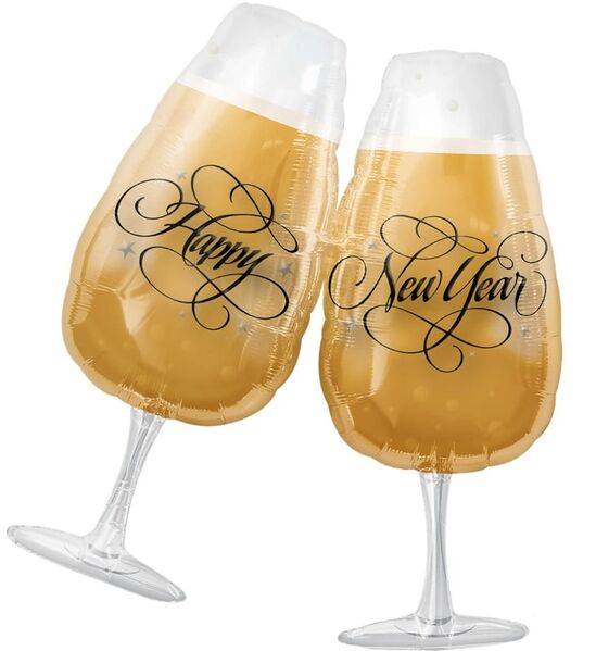 This shaped foil balloon features 2 champagne glasses clinking together with a black cursive 'Happy New Year' message.