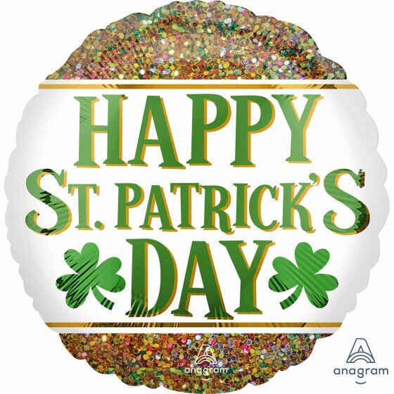 This round foil balloon features a 'Happy St Patrick's Day' message and colourful glitter background.