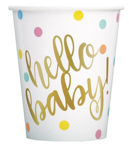 Baby shower themed paper cups, each able to hold approx. 270ml of liquid. 8 in a pack. Colours/design may vary from image.