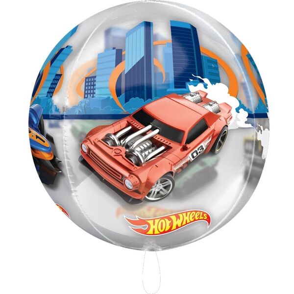 Perfect for Hot Wheel and car racing themes, this balloon inflates to be round like a beach ball and features a clear background with images of 4 different Hot Wheels cars.