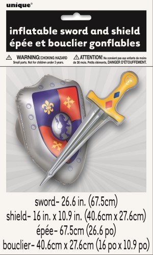 Inflatable sword & shield set, perfect for a medieval costume! Once inflated, sword measures approx. 67.5cm in length and shield measures approx. 40.6cm x 27.6cm.