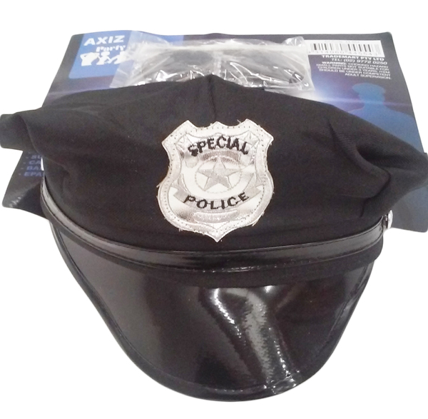 Police costume kit, containing glasses, hat, badge and 2 epaulettes. Designed to fit most adults.