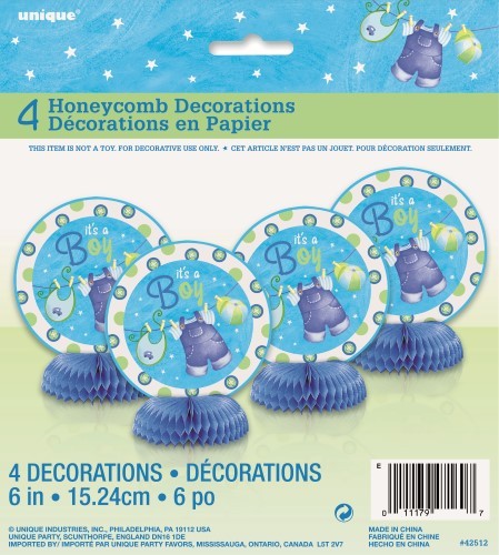 Pack of 4 It's A Boy blue baby shower mini honeycomb decorations. Honeycomb base measures approx. 8cm in diameter, circle on top measures approx. 13cm in diameter and decoration measures approx. 15cm in total height.