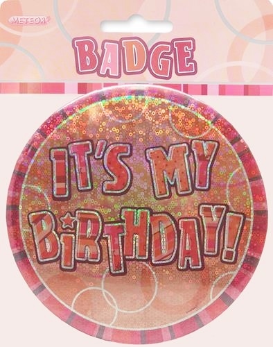 Pink 'IT'S MY BIRTHDAY' badge, measuring approx. 15cm in diameter. Badge has safety pin on the back.