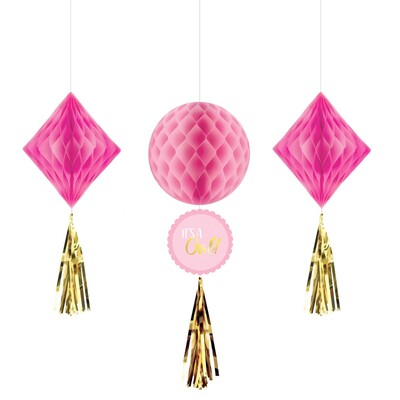 These hanging honeycomb decorations are perfect for any baby shower celebration! With three decorations in a pack (two measuring approx. 33.6cm and one measuring approx. 48.2cm), they're sure to be a big hit! Honeycomb circle decoration has cutout attached. Colours/design may vary from image.