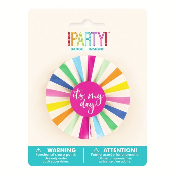 The badge is made from durable cardstock with a pin back and features a folded paper rosette surround - suitable for ages 4+.