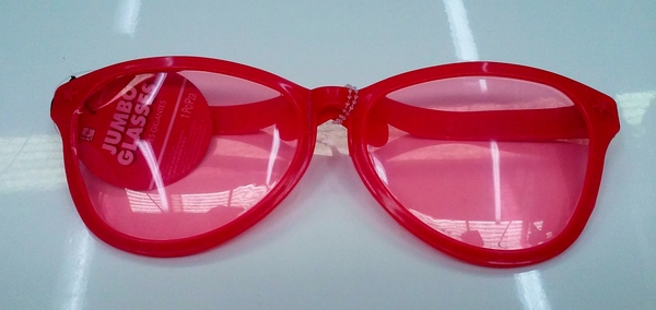 Glasses measure approx. 26cm across and lenses are 7.5cm tall and made from faintly red-tinted plastic.