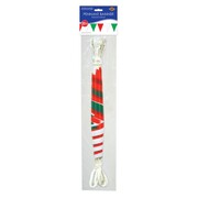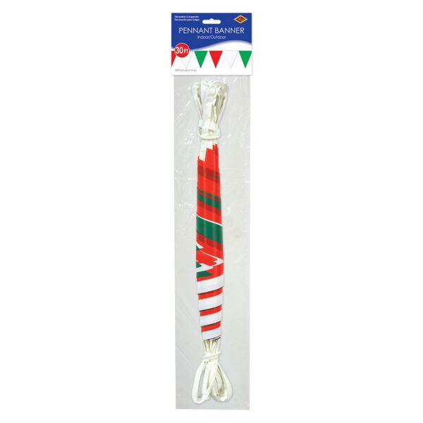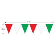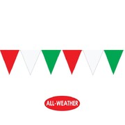 Alternating large green, red & white triangular plastic pennants measuring approx. 30cm wide x 45cm tall are attached to a white plastic ribbon approx. 9.14m/30 feet in length.