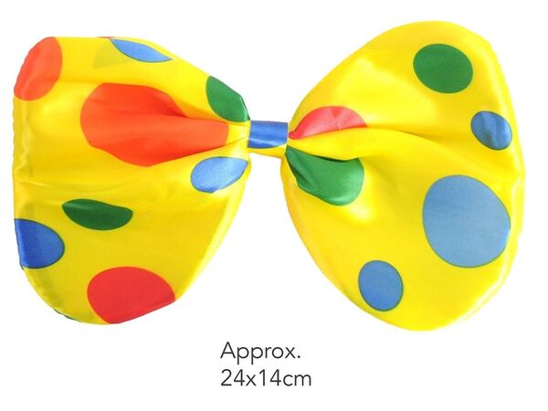 The oversized tie is made from padded yellow satin fabric with colourful spots and is fixed to an elastic neck strap.