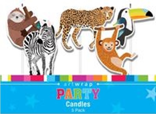 The pack contain 5 individual candles featuring a sloth, zebra, toucan, cheetah & monkey - perfect for your jungle party.