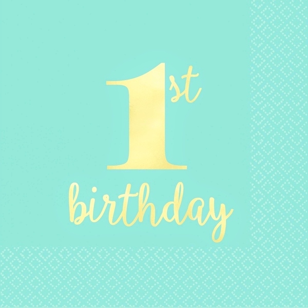 These 2ply cocktail/beverage napkins are the perfect addition to your 1st Birthday party. 16 napkins in a pack featuring Gold Foil printing on a light blue napkin, they're easily coordinated with our other blue and gold 1st birthday supplies!! Measuring 12.5cm x 12.5cm (folded)