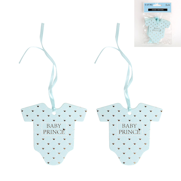 Pack of 12 light blue and gold gift baby onesie tags with 'BABY PRINCE' printing and ties attached, perfect for your baby shower!