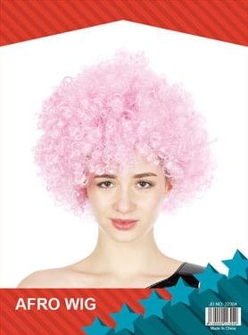 The wig is made from synthetic light pink fibres, styled into a cropped curly style, attached to an elastic cap that will stretch to fit most adult heads.