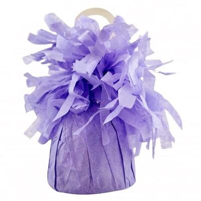 They have a domed weighted centre covered with lilac tissue paper tied with white twine and fringing at the top. It has a white plastic loop at the top for attaching balloons.