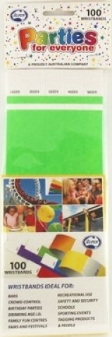 Pack of 100 lime green TYVEK wristbands, perfect for heaps of different occasions! Wristbands are self adhesive and measure approx. 26cm in length x 2cm in width.