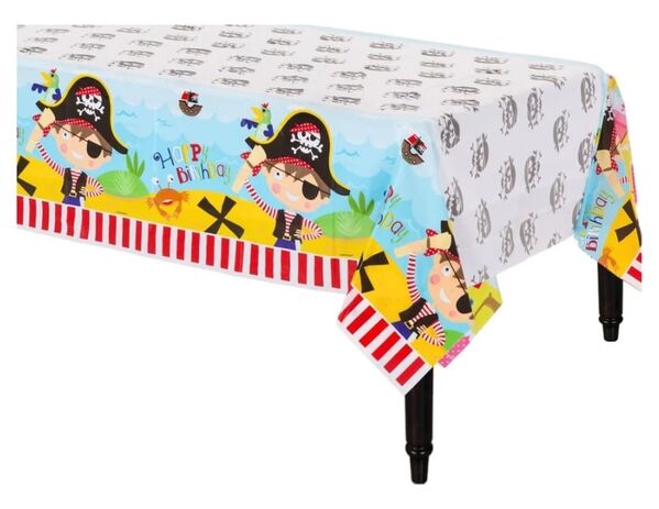 Featuring a colourful Happy Birthday pirate design along the long edges and a skull & crossbones print down the middle, this tablecover measures approx. 137cm x 274cm.