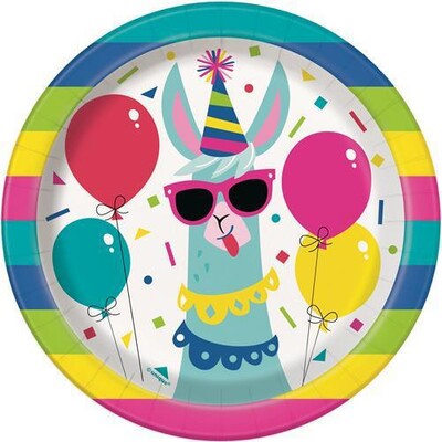 Llama birthday themed paper plates, each measuring approx. 17cm in diameter. 8 in a pack.