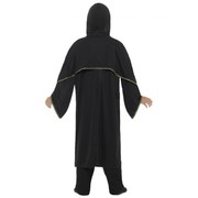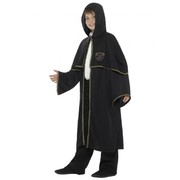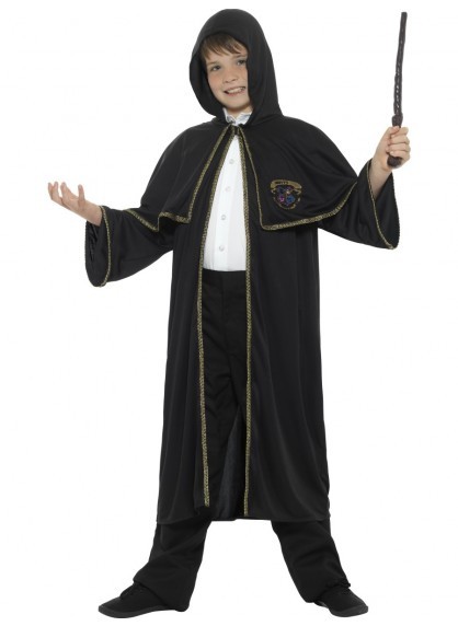 This 3/4 length cloak has an attached hood which can be worn up or down. There is detailing on the hem of the cloak and oversized sleeves. It also has a school crest on the left side of the chest inscribed with the term 'Smiffy's '.