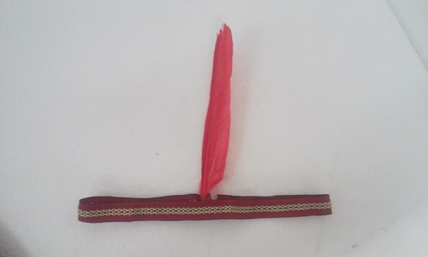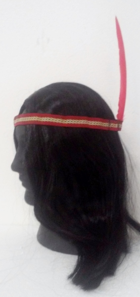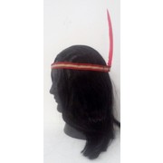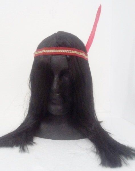Long black Indian brave wig with red feather headband, designed to fit most adults.