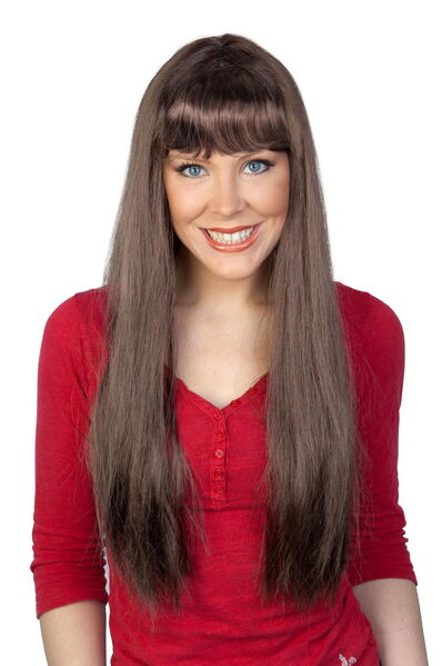 The wig is made from long synthetic brown hair in a straight style with a blunt fringe.