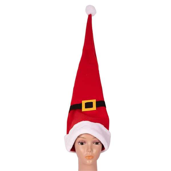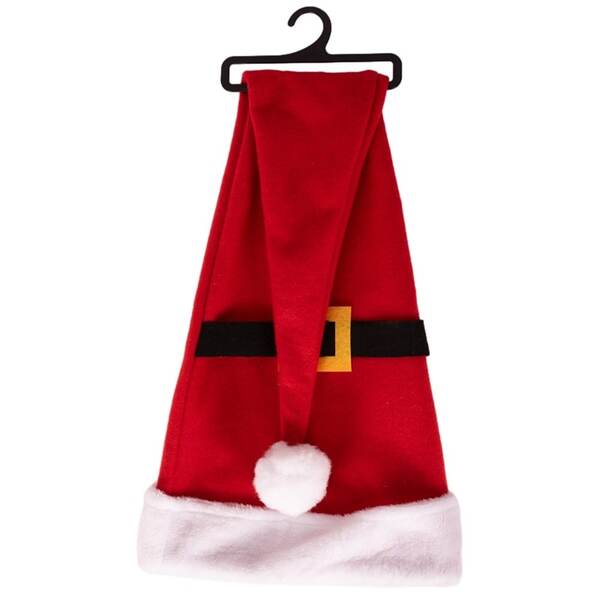 The hat is made from premium red felt and features a black felt belt & buckle decal and fluffy pom pom & trim.