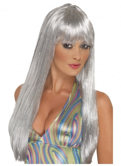 Long straight silver disco wig with silver tinsel strands, designed to fit most adults.