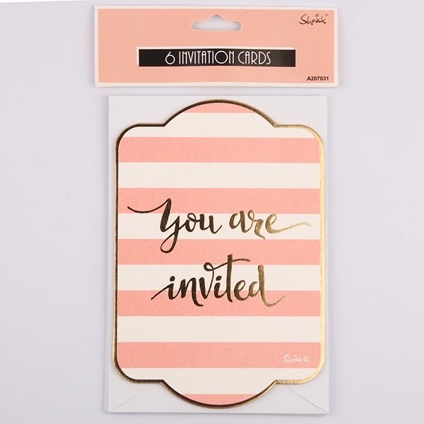 6 paper invitations with white envelopes. Design is coral and white horizontal stripes with metallic gold 'You are invited' script writing on the front. Invitation is one piece of card with details to be written on the back. Back of invitation is white with black writing. Invitations measure 11.5cm wide and 17cm in height and fits perfect in the envelopes provided measuring 12cm x 17.5cm.