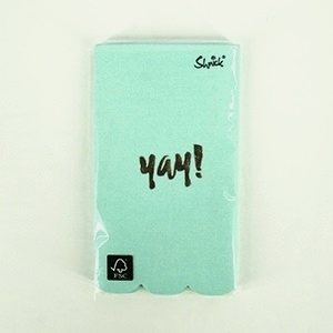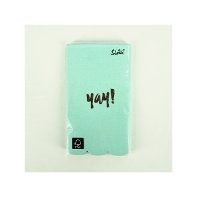 Pale green / blue lunch sized napkins with a scalloped edge and gold metallic 'yay!' writing . 15 per pack measuring 11cm wide and 19cm long (folded size) or 40cm x 33cm (unfolded size.)