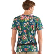 Design on shirt: Hawaiian floral print with a camera and a bum-bag.