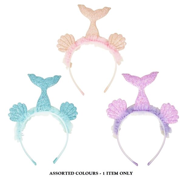 Featuring a sparkling foam tail and shells with a tulle ruffle, this headband is perfect to wear at your party or to use as a fun prop for photos.