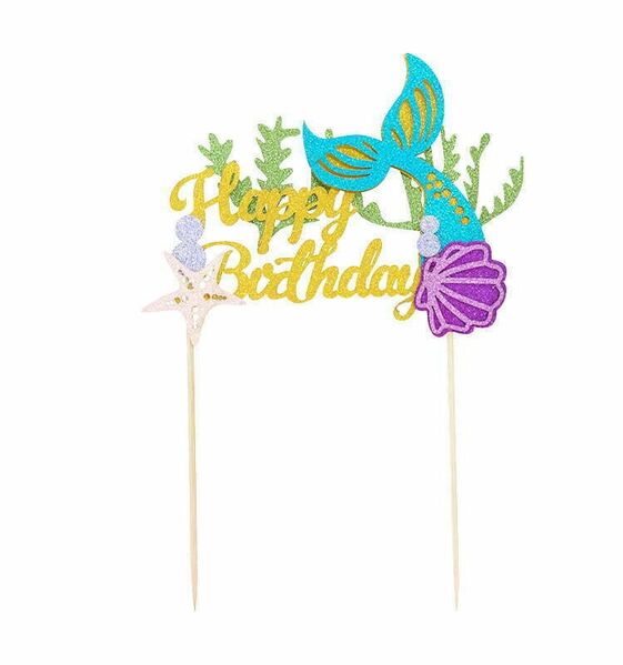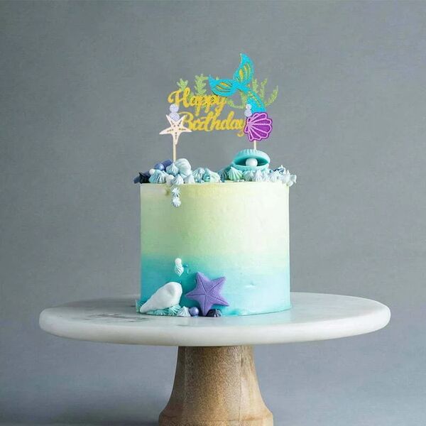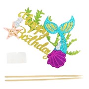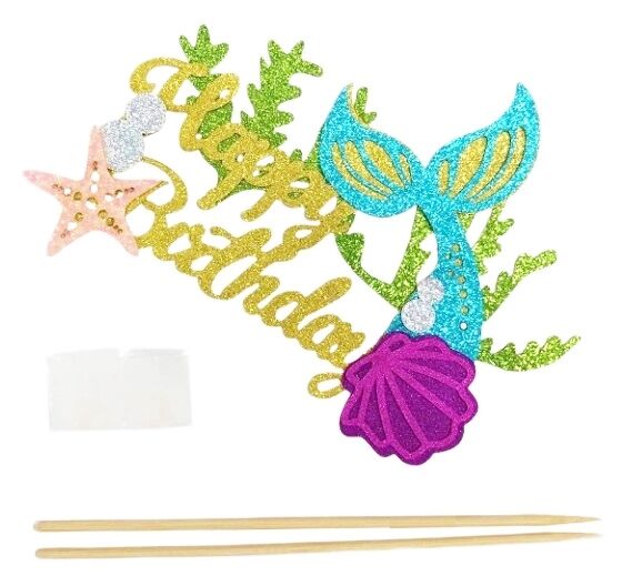 Featuring layered glitter cardstock bubbles, shell, starfish, sea foliage and a focal blue & gold mermaid tail with gold script 'Happy Birthday' message, this stunning topper measures approx. 15.5cm (w) x 11cm (h).
