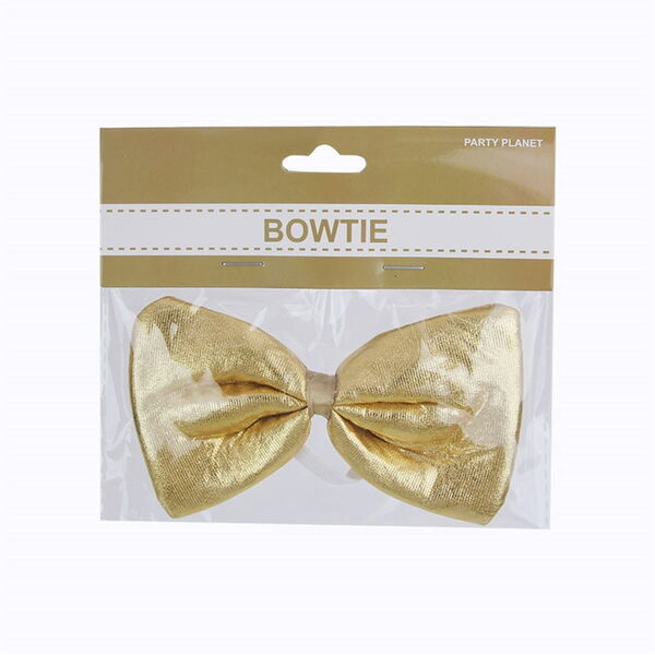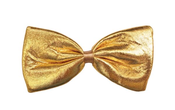 The tie is made from metallic gold fabric and has an elastic strap around the neck.