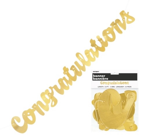 Metallic gold congratulations banner, measures approx. 1m in length. Colour may vary slightly from image.