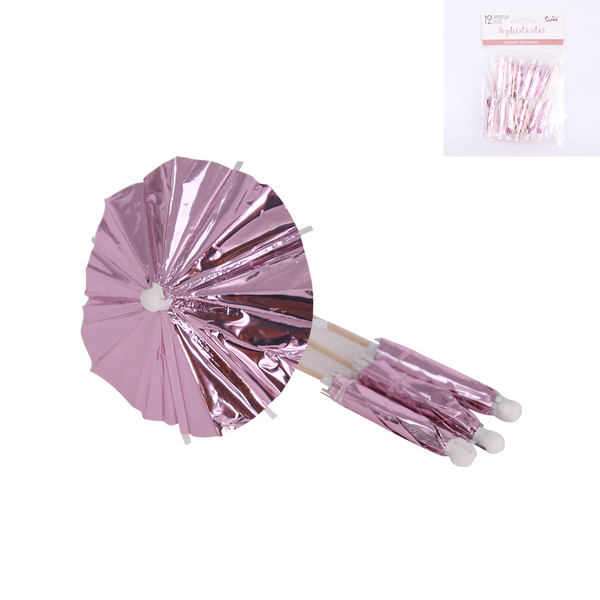Pack of 12 pink foil umbrella picks - decorative toothpicks with parasol on top.