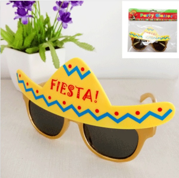 These Mexican sombrero glasses are perfect for any fancy dress occasion! Gold frame glasses with dark lenses featuring a yellow Fiesta sombrero on top. Coordinate with the rest of our Mexican costume accessories for your complete fiesta outfit!
