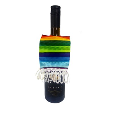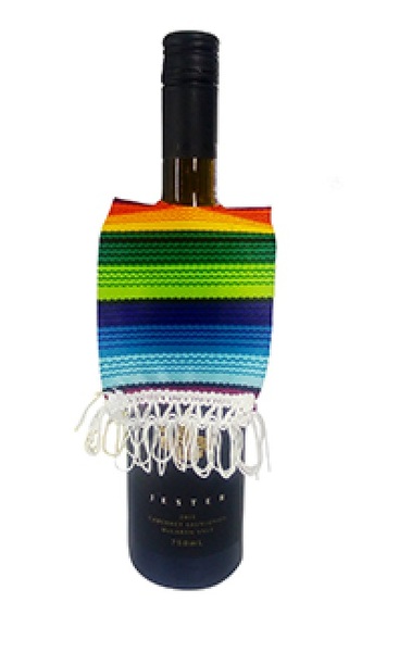 Mexican poncho style drink cosy, perfect for heaps of different occasions! Can be used on bottles of any sort. Cosy measures approx. 16cm in length on each side and a neck hole of approx 3.5cm diameter