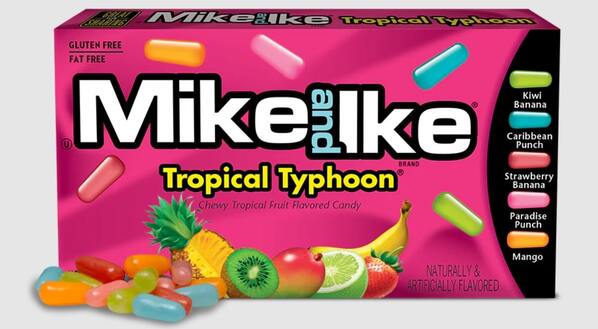 MIKE AND IKE® TROPICAL TYPHOON® is jam-packed with five tropical FRUCHEWY® flavoured candies to send your taste buds twirling!