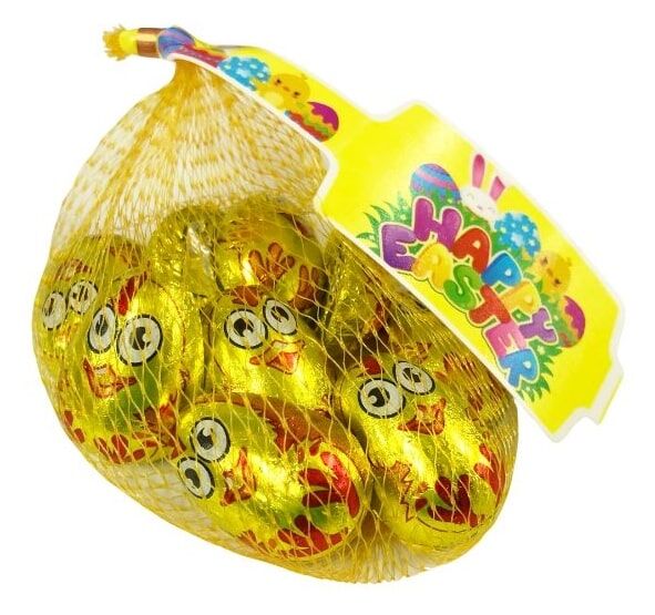 The mesh bag contains 70g of gold foil-covered milk chocolate chicks (approx. 9-10 pieces) - a delightful treat!