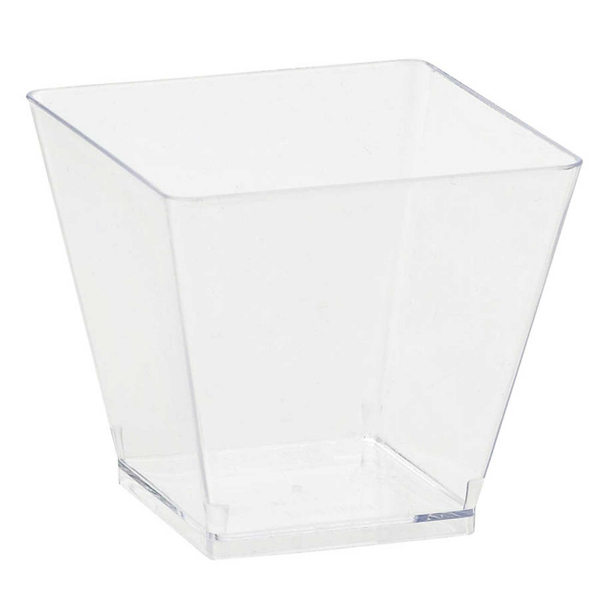 Pack of 40 mini clear plastic cocktail bowls, each with a holding capacity of approx. 59ml. Bowls measure approx. 4.5cm in height and 5cm x 5cm at their opening (3cm x 3cm at their base.)