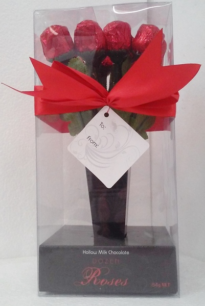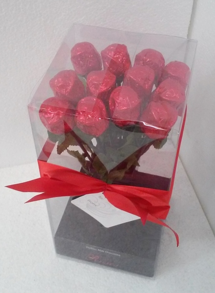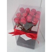 Mini milk chocolate roses in a boxed bouquet, each rose measuring approx. 23cm in total length and weighing approx. 7g. Pack of 12.