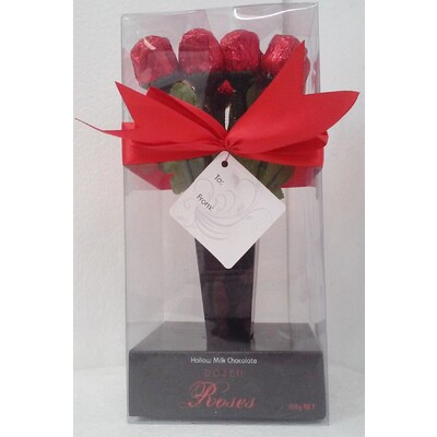 PLEASE NOTE: Only red foil wrapped part of rose is chocolate. Chocolate rose is hollow.