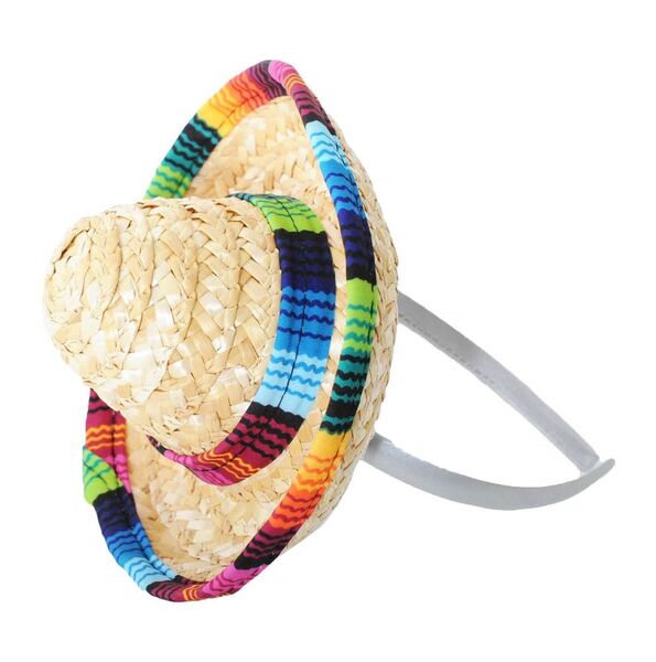 Measuring just 13.5cm diameter x 6.5cm tall, the mini hat has all the features of a larger sombrero - woven straw construction, upturned brim, colourful fabric trims - all on a silver headband. You can move the hat along the headband to sit it at an angle or straight up - your choice!