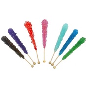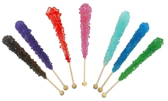 - Large coloured and flavoured sugar crystals stuck onto a wooden stick