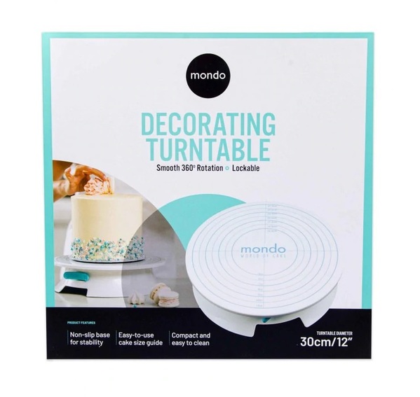 The Mondo Cake Decorating Turntable makes cake decorating easier in every step of the process, from leveling to icing, smoothing the sides and creating detailed designs.