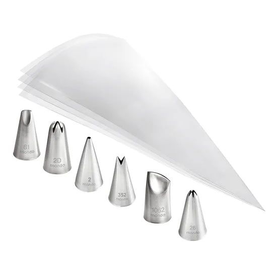Each set includes six piping nozzles and four disposable bags, ideal for cakes, cupcakes, cookies and more.