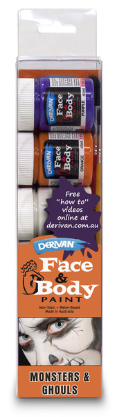 This handy face paint set is perfect for any scary party! This set includes 5 x 40ml jars of face paint (white, orange, purple, green and black), 1 applicator sponge and 2 paint brushes, as well as face painting directions and examples to provide you with inspiration! Simply apply over a dried coat of barrier cream or moisturiser using the brush or sponge included in the pack, avoiding the eyes, mouth and nasal passages. Easily removed from skin and clothing with soap and water. Sure to be a big hit at the party!