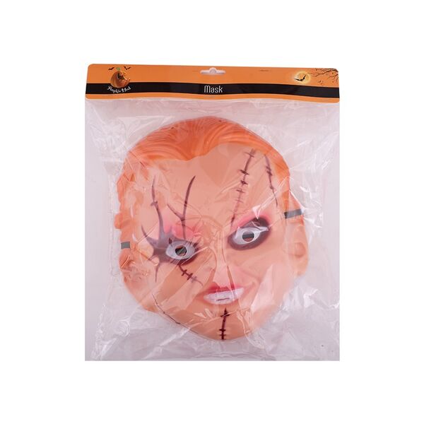 It is made from rigid plastic and has moulded orange hair, creepy stitched wound detail and eye, mouth & nose holes.