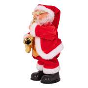He is a traditionally dressed in his classic red and white suit with the addition of a gold waistcoat, sunglasses and saxophone.