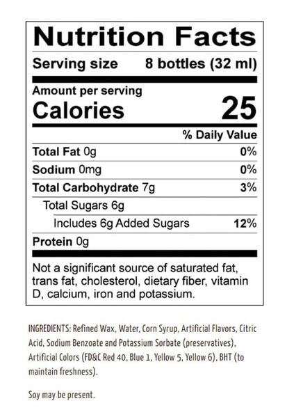 Each wax bottle is designed for a unique candy experience: Nip off the top, drink the liquid, then chew up the wax bottle like a piece of gum.