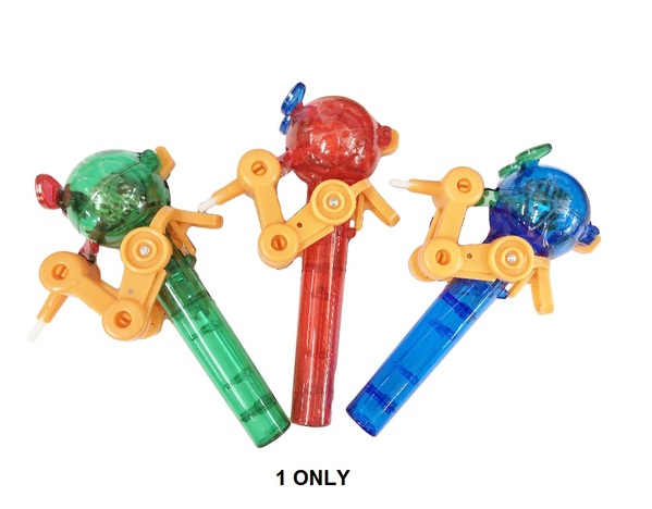 - Press the lever on the back and the arms extend the lollipop, release the lever and the lollipop goes back into the mouth